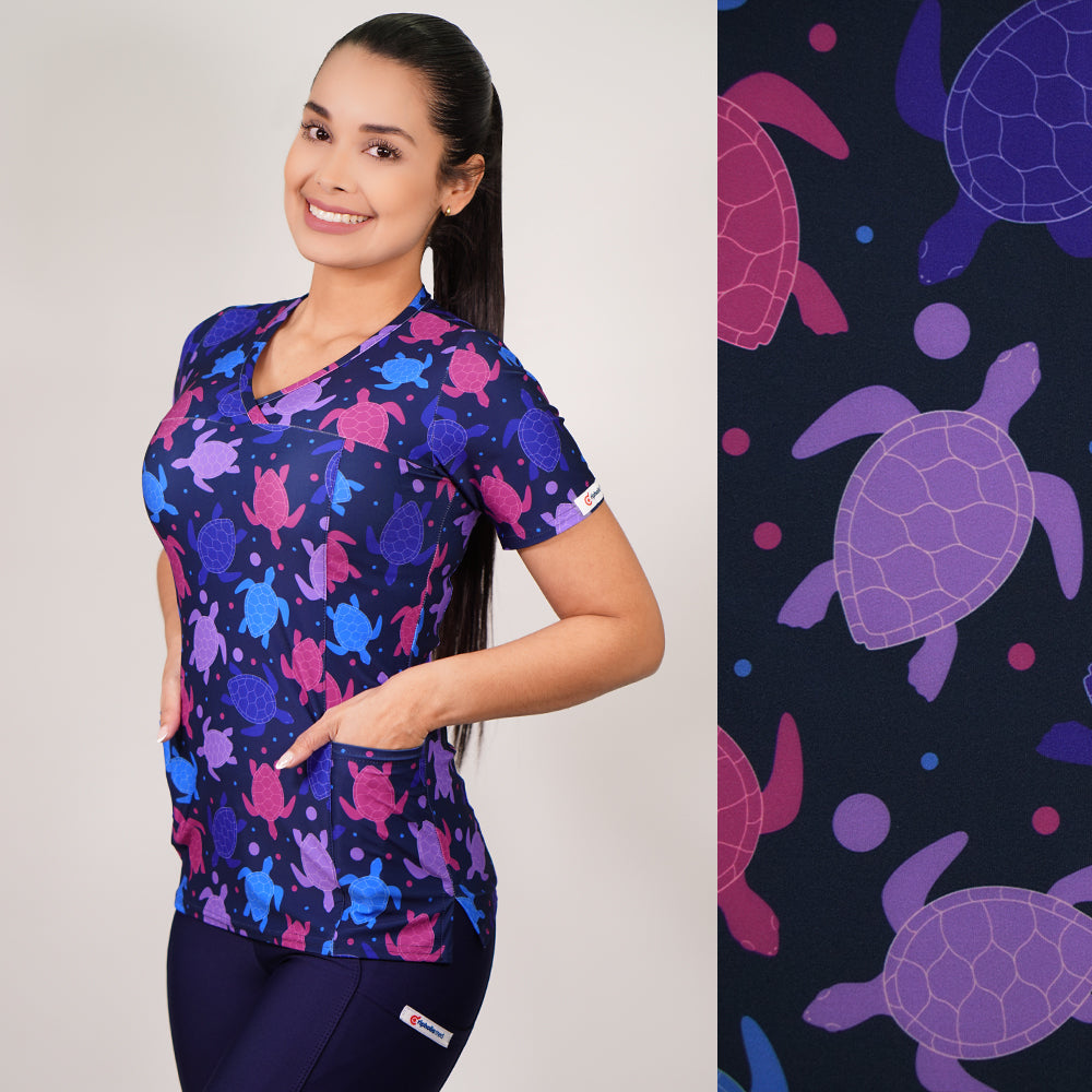 Delantal Mujer tela elasticada estampada Tortuga. Combina con Azul Marino - Art. 2511