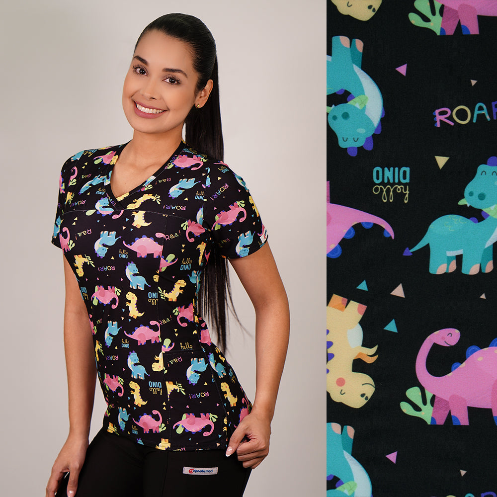 Delantal Mujer tela elasticada estampada Dinosaurios. Combina con Negro - Art. 2516