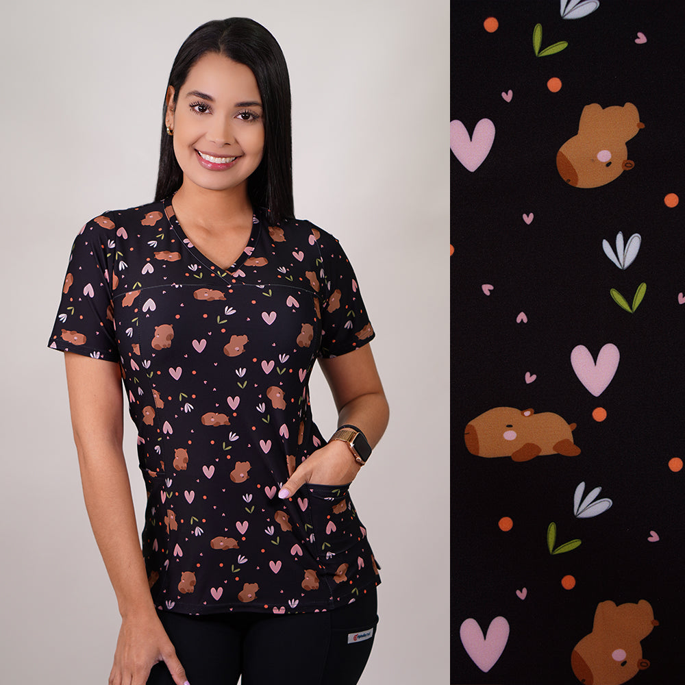 Delantal Mujer tela elasticada estampada Capibara. Combina con Negro - Art. 2517