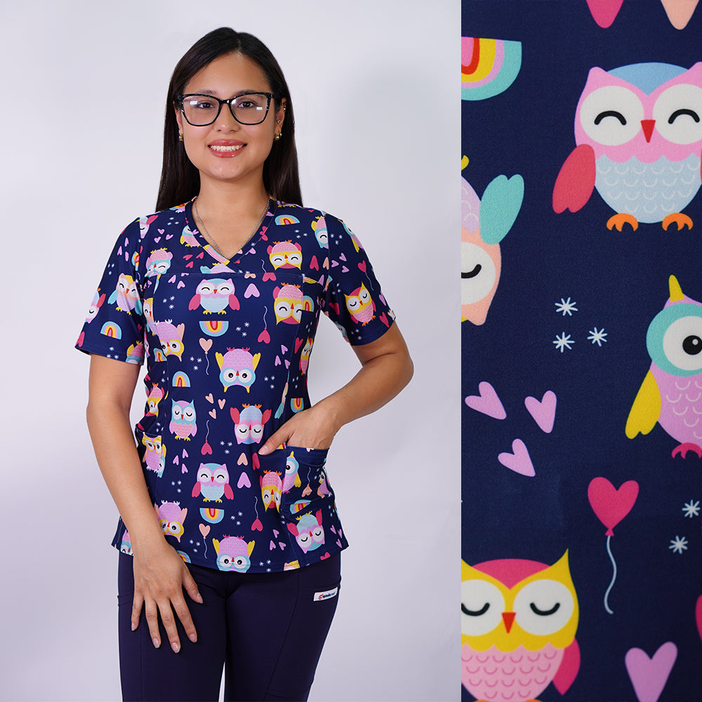 Delantal Mujer tela elasticada estampada Búho. Combina con Azul Marino - Art. 2527