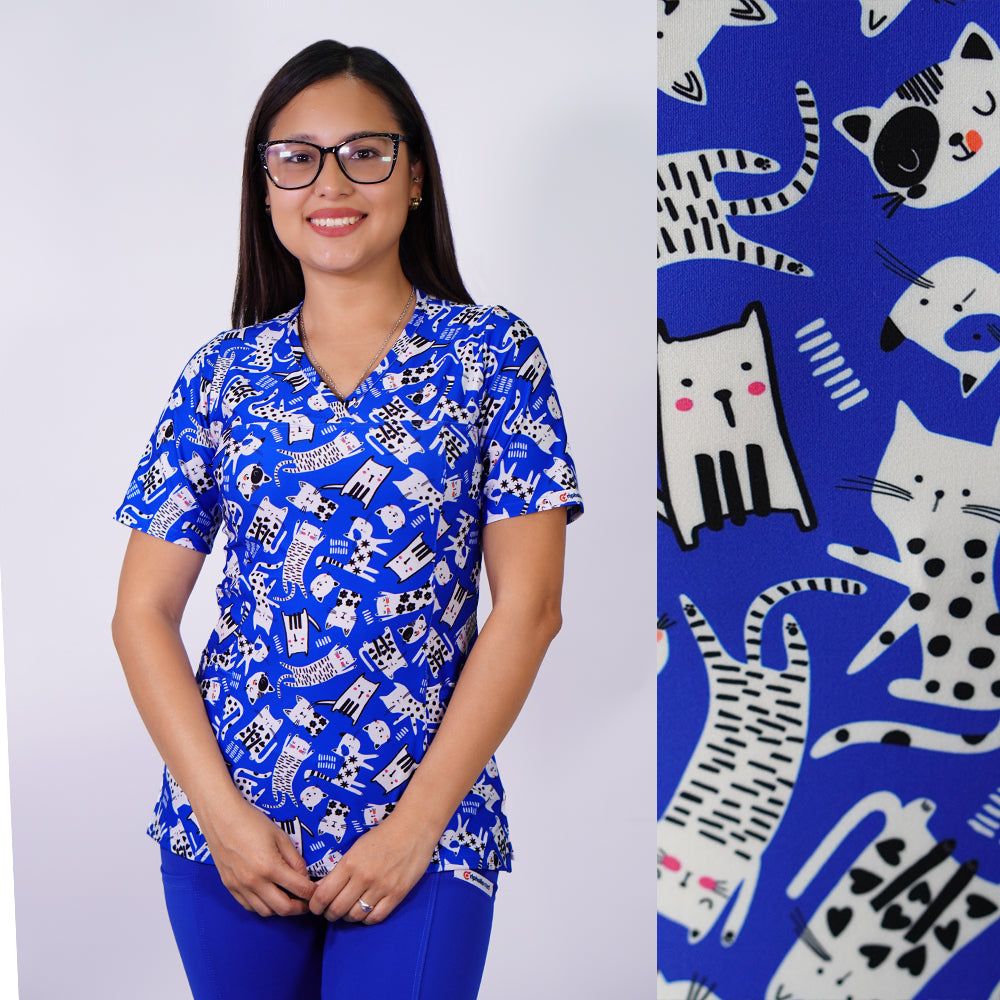 Delantal Mujer tela elasticada estampada gatitos. Combina con azul rey - Art. 2530