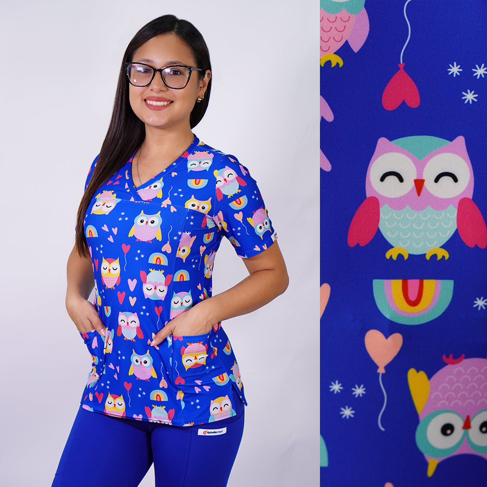 Delantal Mujer tela elasticada estampada Búho. Combina con Azul Rey - Art. 2542